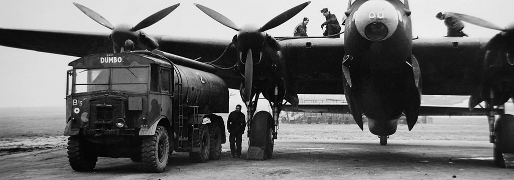 An AE Matador fuel bowser (this one named “BABY DUMBO”) is backed up to the Lancaster which took 2154 gallons of fuel in the wing tanks on its longest sorties.